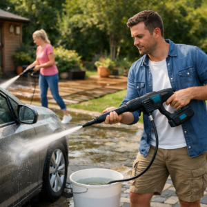 De kracht van dit apparaat verraste me positief. Met een druk tot 50 bar en een bereik van ongeveer 10 meter is hij sterk genoeg om vastzittend vuil los te krijgen, maar niet zo agressief dat je bang hoeft te zijn voor schade. Denk aan auto’s, scooters, tuinmeubels, gevelranden, rolluiken of zelfs een modderige kinderwagen.