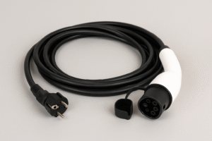 De eerste indruk? Rustgevend. De kabel heeft geen groot zwart “blok” in het midden, wat bij veel laders fungeert als adapter. Dit model sluit je gewoon rechtstreeks aan: een standaard EU-stekker aan de ene kant en een witte Type 2-aansluiting aan de andere kant. Plug & play, letterlijk.