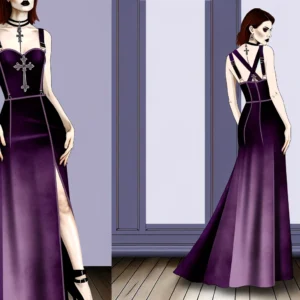 Dit meesterwerk, vervaardigd uit het fijnste suède, straalt een luxueuze textuur en een diepe paarse tint uit die onmiddellijk de aandacht trekt. Het ontwerp, verfraaid met subtiele kruisdecoraties, voegt een laag van mystieke schoonheid toe die zowel tijdloos als grensverleggend is. De jurk, met zijn unieke suspender-stijl en een lange, zwierige rok, omarmt de drager in een aura van gotische grandeur, waardoor een onuitwisbare indruk achterblijft.