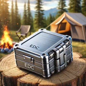 De afbeelding toont de robuuste en stijlvolle EDC Titanium Alloy Square Box met groot scharnier en dikke schalen, ontworpen voor winddichte bescherming. De doos wordt weergegeven in een outdoor kampeeromgeving, met een tent en kampvuur op de achtergrond, wat de draagbaarheid en veelzijdigheid benadrukt.