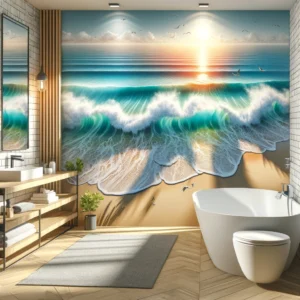Ontdek de Magie van een Zeebries in Je Eigen Badkamer met Onze 3D Strandgolven Muurschildering