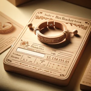 De armband is zorgvuldig gegraveerd op een houten houder, ideaal om als aandenken te bewaren. Het wordt geleverd met een bijbehorende kaart die kan worden gepersonaliseerd met gegevens zoals de naam van de baby, geboortedatum, gewicht en lengte, wat het een nog persoonlijker cadeau maakt. Of het nu voor een babyshower is, als kraamcadeau, of gewoon om de nieuwe ouders te verrassen, deze armband biedt een speciale manier om de geboorte van een nieuw leven te vieren.