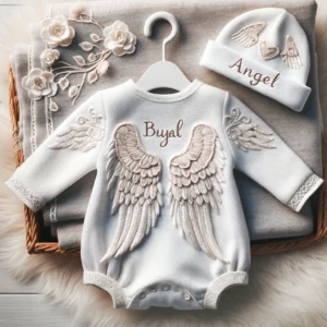 Deze set bestaat uit een rompertje en een bijpassende deken, beide met liefdevol handgemaakte engelenvleugels. Het unieke aan dit product is dat het personaliseerbaar is met de naam van de baby, wat het een extra persoonlijke touch geeft. Of het nu gaat om het verlaten van het ziekenhuis of om een speciale fotoshoot, deze outfit zal zeker de show stelen en prachtige herinneringen creëren.