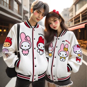 De Sanrio Kuromi Cinnamoroll baseball uniform jas is een perfecte mix van schattigheid en functionaliteit. Deze winddichte jas, geïnspireerd door geliefde Sanrio-personages zoals Kuromi, Cinnamoroll en My Melody, is niet alleen een modieuze keuze maar ook praktisch voor de koude dagen. Met een los en warm ontwerp is deze jas ideaal voor zowel vrouwen als koppels die hun liefde voor Sanrio willen tonen.