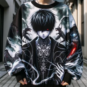 Deze opvallende pullover kenmerkt zich door een intrigerend gothic anime-printpatroon dat gegarandeerd de aandacht trekt. Het is een perfecte blend van moderne streetwear en de nostalgische vibes van de vroege jaren 2000, waardoor het een must-have is voor iedereen die graag experimenteert met hun stijl. Met een comfortabele O-hals en een oversized pasvorm biedt deze trui niet alleen een opvallende look, maar ook maximaal comfort voor dagelijks gebruik.