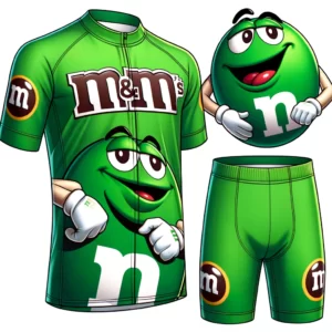 Een Groene Revolutie op Wielen De kleur groen staat symbool voor leven, vernieuwing en energie. Dit is precies wat de groene M&Ms geïnspireerde fietsshirt set brengt op elke rit. Met een groot M&M poppetje prominent op de jersey, brengt deze outfit niet alleen kleur op de weg, maar ook een glimlach op de gezichten van iedereen die je passeert.